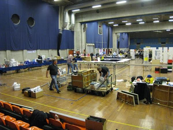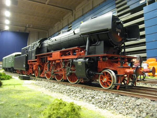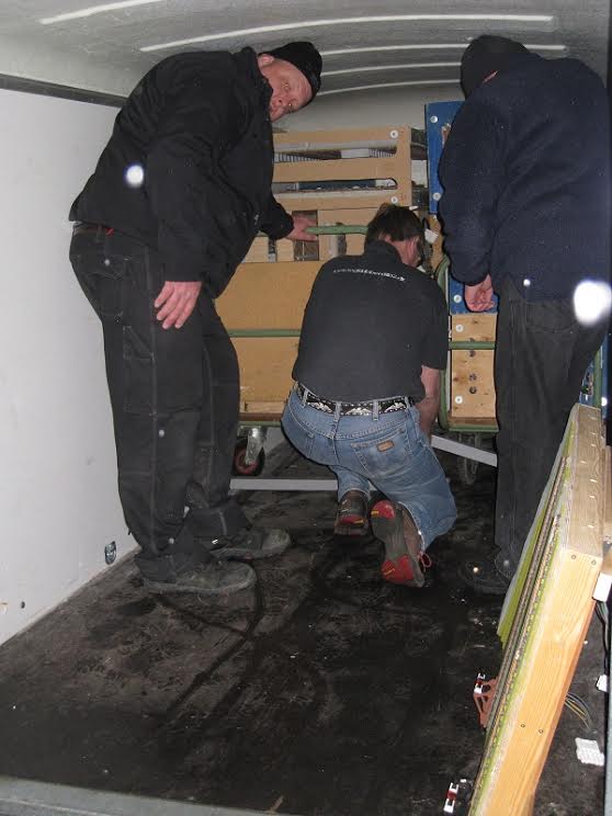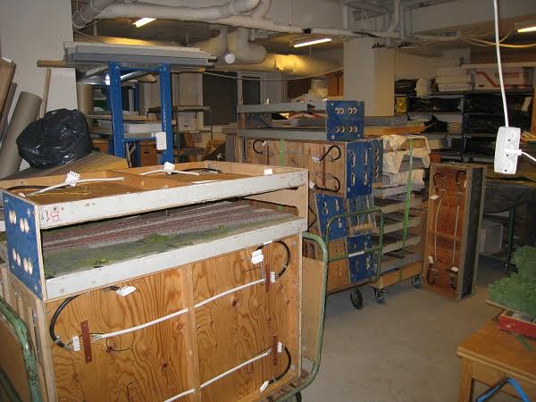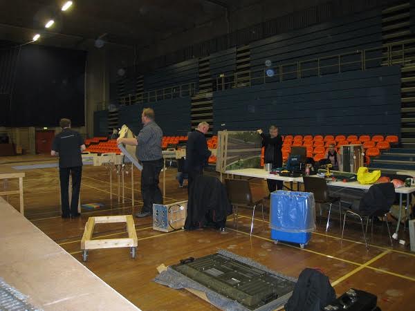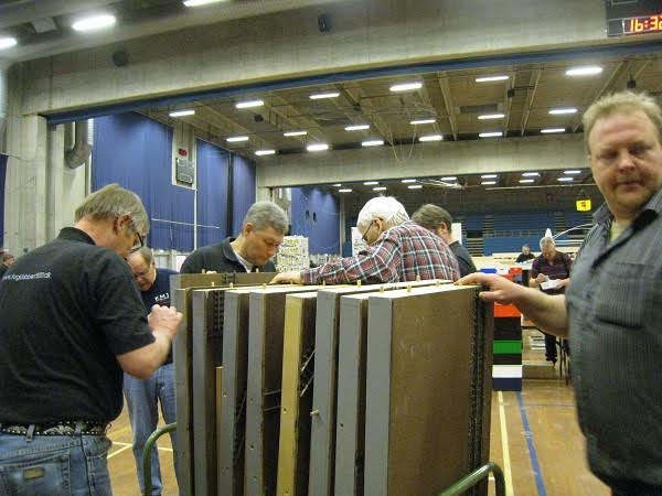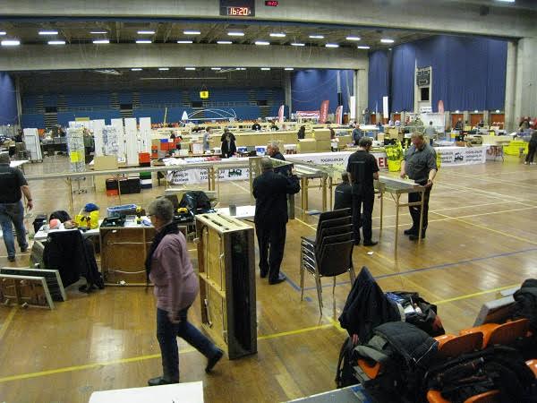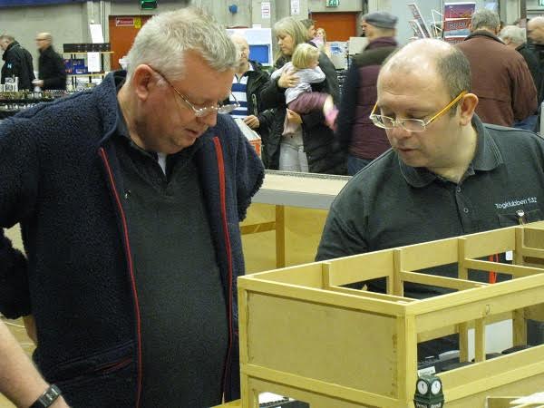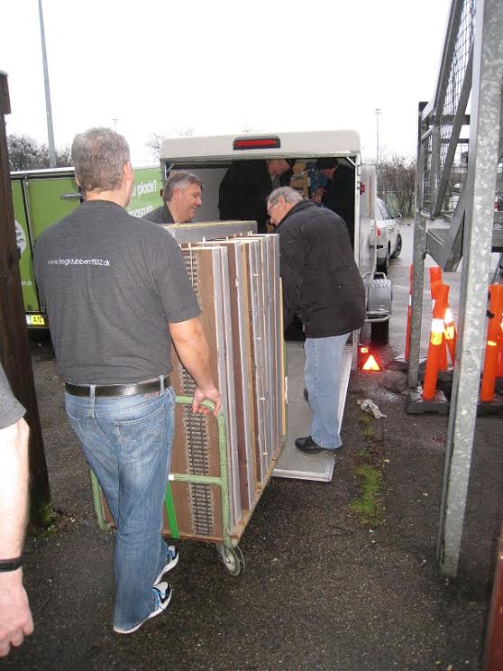 “På Hobbymessens anden dag (den 6. marts) var der igen gang i togkørslen. På det andet billede ses fem veldædige medlemmer af klubben, fra venstre Steen, Kurt, formanden Peter, Paolo og næstformanden Peter (i denne klub kan man kun avancere til de mest betroede stillinger i bestyrelsen, hvis man har navnefællesskab med den første biskop i Rom). De sidste billeder er fra nedtagningen af anlægget. Det tog kun lidt over to timer, en ny klubrekord.”