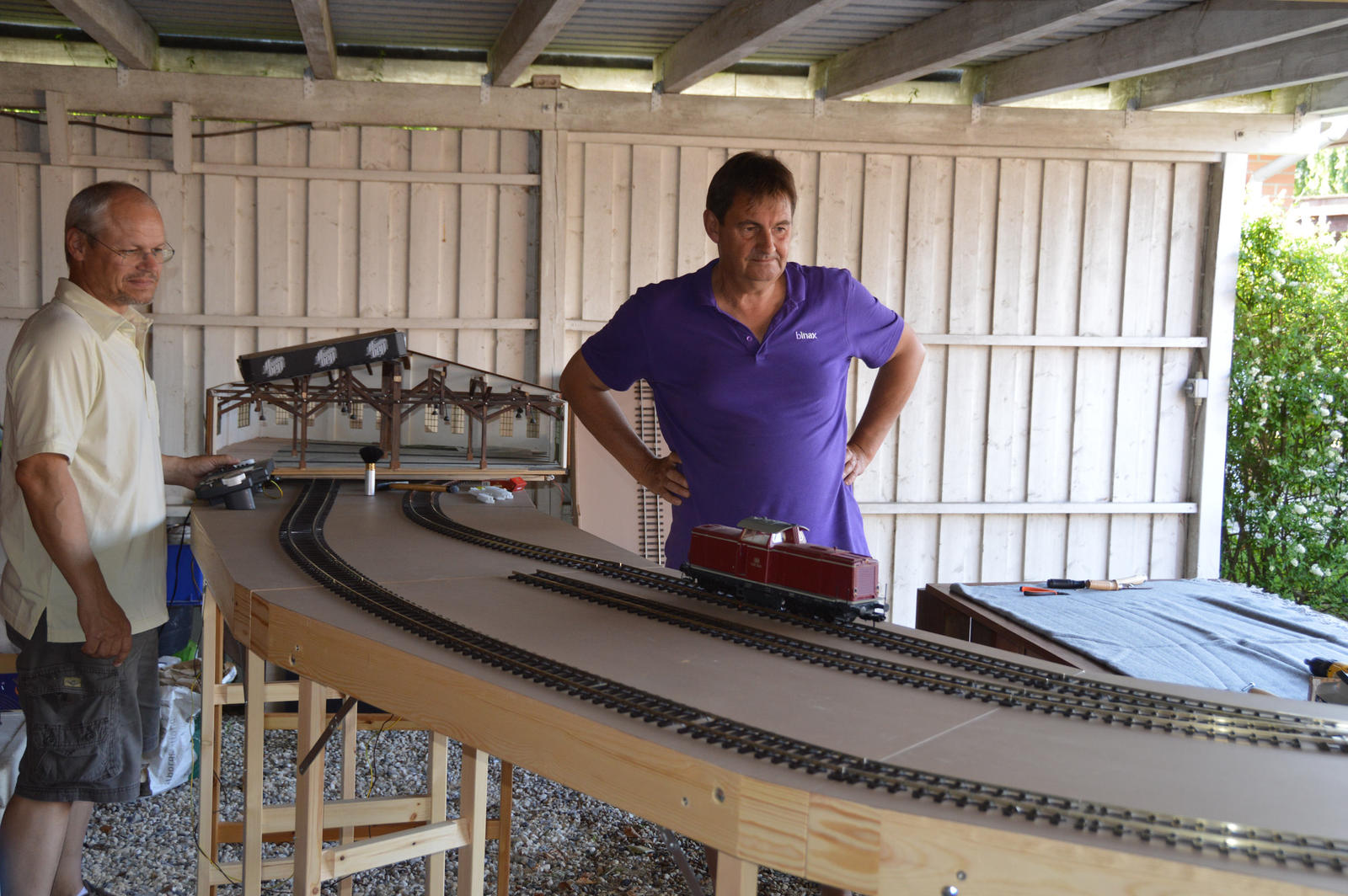 Der trækkes strøm til skinnerne på de nye kurvemoduler, her er Niels og René de flittige hænder, men de holdes under skarpt opsyn af overmontøren.