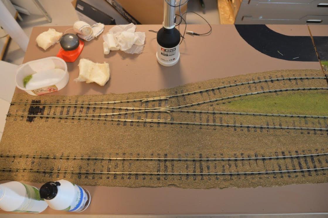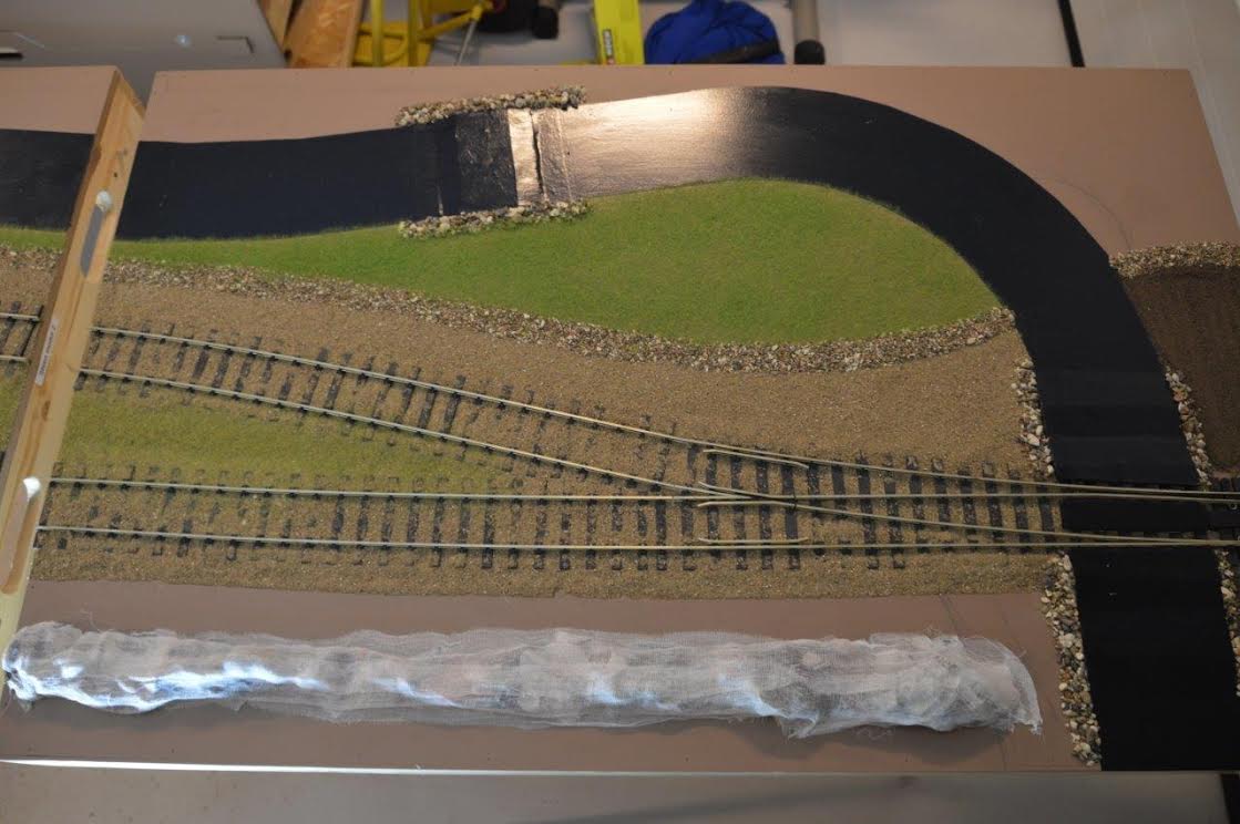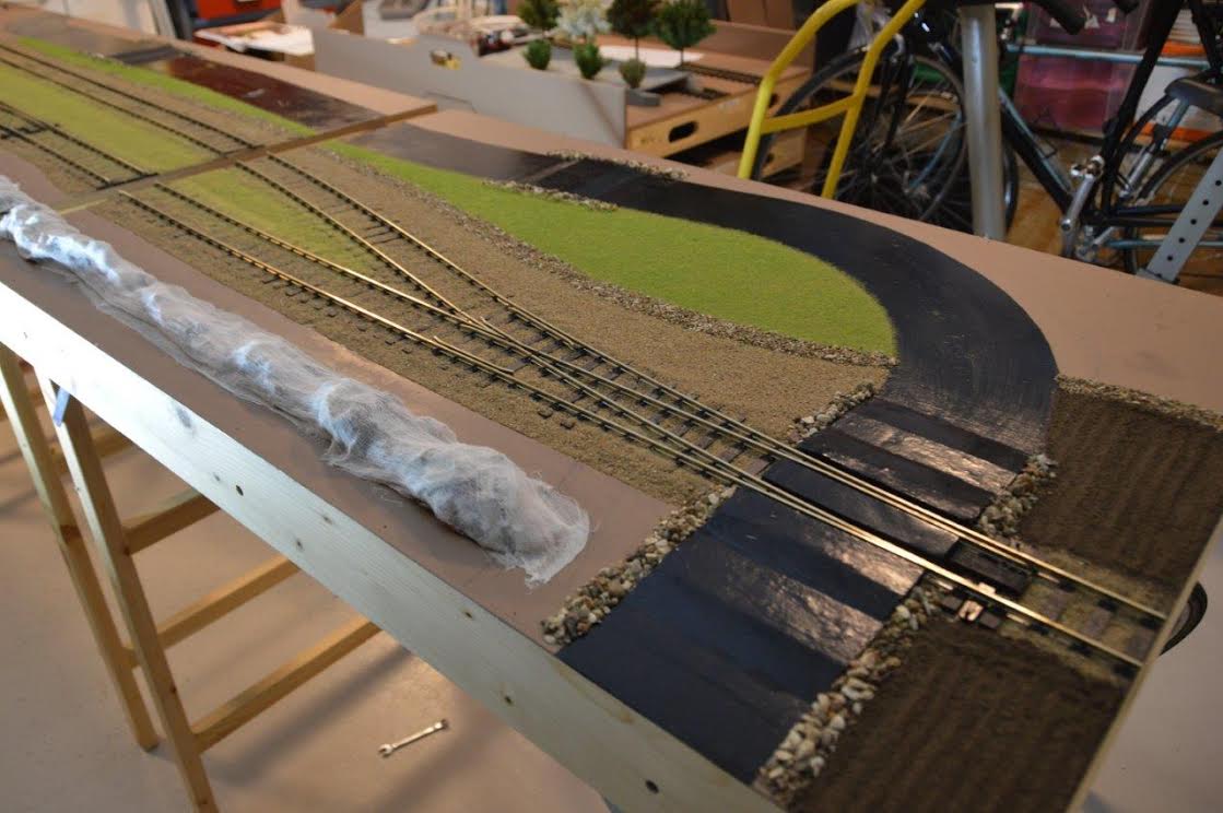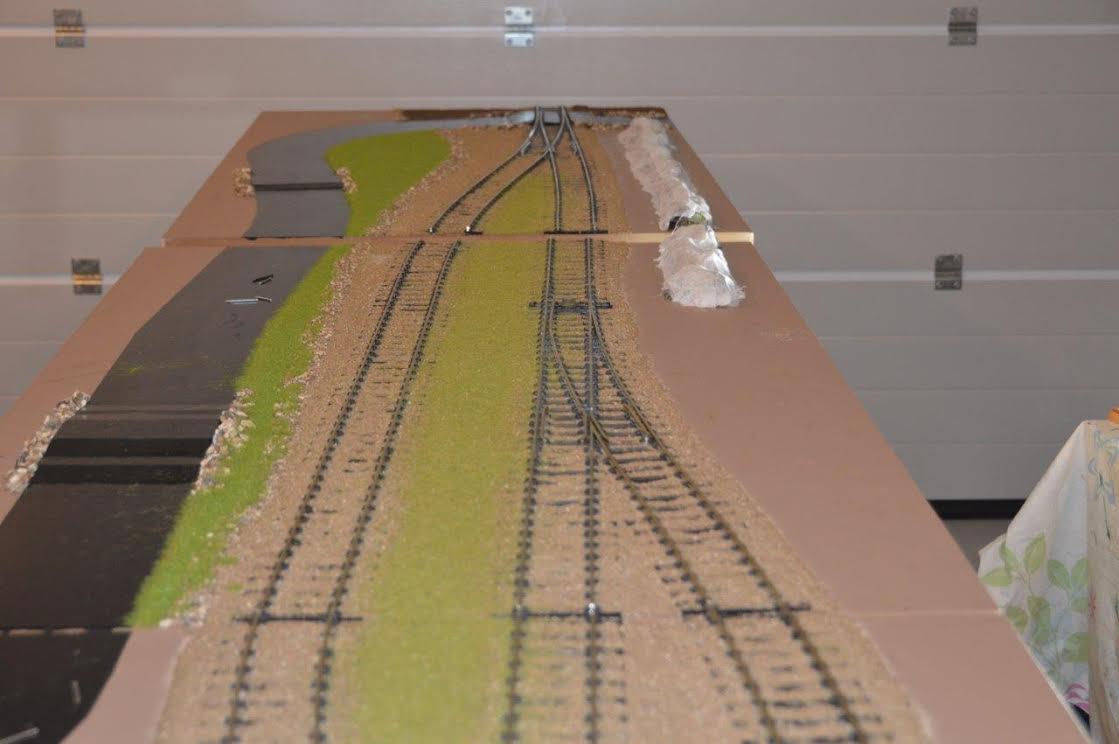 På de otte moduler (seks lige og to kurvemoduler) der kommer til at indeholde Skrøbelev station, er landskabet nu begyndt at spire frem på de tre første af de lige moduler, dem der vender mod vest, i retning af Rudkøbing havn projektet.