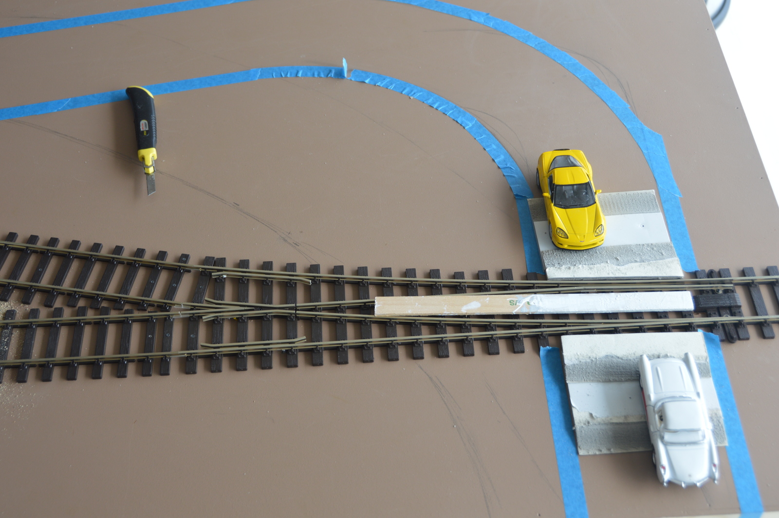 Opkørslerne til jernbaneoverkørslen samt vejbumpene er opbygget i Kappa-fix dækket med papmache, og sluttelig malet med sort farve.