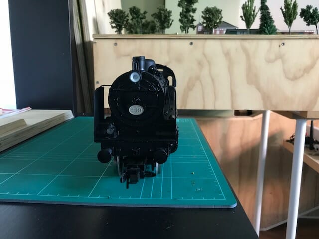“Her er mit sommer projekt. Ombygning af en Märklin DB BR 38 til DSB T 299 anno 1948. Jeg forsøger at komme så tæt på forbilledet som muligt. Der er nye sikkerhedsventiler PoP typen i messing fra Tikøb Støberi. Skorsten afkortet. Stige monteret i venstre side, olie lampe som øverste frontlanterne, højre forlygte, front nummerplade fra Freja modeller. Jeg har købt et par snenæser også hos Tikøb Støberi. Derudover er alt malet sort mat. Fra SB-modelbau har jeg bestilt en Faulhaber motor, desuden har jeg en ESU XL dekoder som skal omprogrammeres med BR 38 lyd. Næste skridt er tenderen. I øvrigt købte jeg modellen på e-Bay, det er en Märklin 5747, altså en gammel svend.”